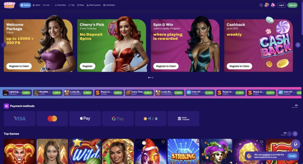 CandySpinz es un casino en línea lanzado en noviembre de 2024, afiliado a Terdersoft B.V. (propietario de BDM Bet). Ofrece más de 5000 juegos, entre los que se incluyen tragamonedas de Pragmatic Play, Evolution y NetEnt. Con un colorido diseño temático de caramelos, ofrece un bono de bienvenida de hasta 1500 € + 300 tiradas gratis y acepta criptomonedas. Licencia de Curazao (GCB) y atención al cliente las 24 horas.