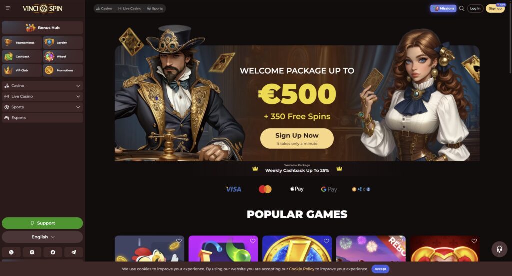 VinciSpin es un casino en línea lanzado en 2024 que ofrece más de 6000 juegos de desarrolladores de renombre. Ofrece un bono de bienvenida de hasta 500 € + 350 tiradas gratis. Regulado por Curazao, ofrece una interfaz intuitiva y una versión móvil, con promociones mediante códigos promocionales como 100VINCI1 para 100 tiradas gratis al registrarse.