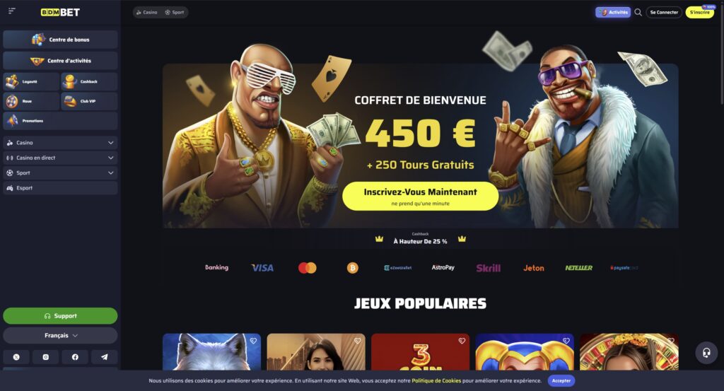 El casino atrae por su variada oferta, los rápidos retiros en criptomonedas (menos de 24 horas) y las promociones regulares. Ideal para los amantes de las máquinas tragamonedas o las apuestas deportivas, ofrece un bono del 100 % hasta 1000 € + 50 tiradas gratis. Sin embargo, algunas ofertas requieren un depósito mínimo (por ejemplo, 20 € por 40 tiradas) y condiciones de apuesta elevadas (x40) pueden limitar las ganancias.