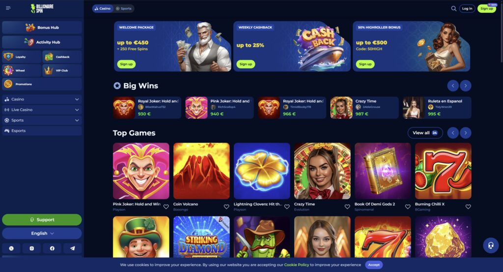BillionaireSpin atrae por su variedad de juegos, sus generosos bonos y sus torneos diarios. Ideal para los amantes de las máquinas tragaperras y las competiciones, ofrece un acceso rápido a través de una aplicación gratuita. Sin embargo, los elevados requisitos de apuesta (x30) y la falta de opciones de pago tradicionales pueden suponer un problema para algunos usuarios.
