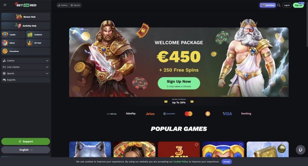 BetOnRed es un casino en línea y un sitio de apuestas deportivas lanzado en 2023, regulado por Curaçao. Ofrece más de 4000 máquinas tragamonedas de más de 100 editores, juegos en vivo y un bono de bienvenida de hasta el 255 % (450 €) + 250 tiradas gratis. Compatible con dispositivos móviles, está dirigido a los amantes de los juegos variados y las promociones regulares.